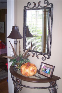 A few days ago we set out to crown the Hospitality Queen. So far my dear friend Amy, hereforth know as HQ, is in the lead with a whopping 28 – wow! I can testify that her score should be at least that if not more – she really is the hostess with the mostest around here! I’m still working on my fall decor so I decided to give you a tour of the HQ’s home. So off we go…