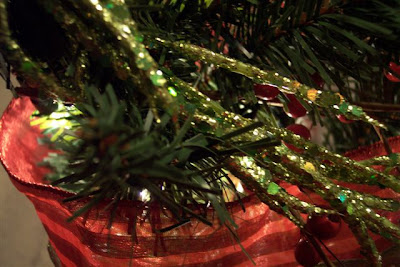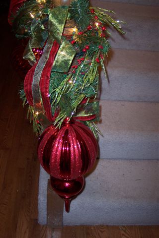 I had a hard time deciding on what to do with my banister this year. I’ve always used gold. With the door being lime green and red I wanted something that better coordinated with it. I also didn’t want to spend any money. I guess I could have done the big mesh look like on the door because I have plenty of that left over but that seemed like overkill for my eight foot ceilings. So here’s what I came up with.