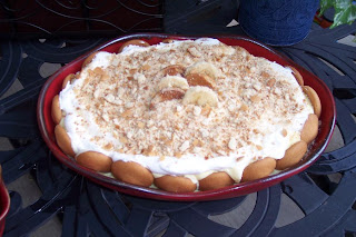 In medium size dish (I used my slah Cinnabar Baker), arrange a single layer of vanilla wafers. Add a generous layer of sliced bananas. Cover with half of pudding mix. Add another layer of vanilla wafers then sliced bananas over pudding. Stand vanilla wafers along edge of dish. Pour in remaining pudding mix. Spread remaining Cool-Whip on top of pudding. Garnish with crushed vanilla wafers and banana slices. Cover and chill before serving. Overnight is best. Enjoy!