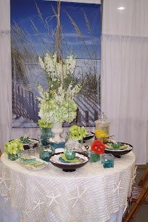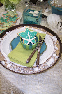 And a closeup of the place setting. Never thought of using actual sand and shells but it works in our new Cyprus Footed Bowl as a charger!
