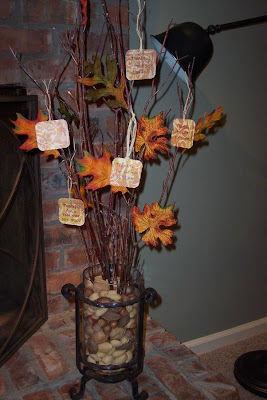 I crafted this one using several ideas from magazines and last year’s blogosphere. There were too many individual inspirations for me to remember! If you see your idea claim it in the comments and I will update this post! I started with a bag of nuts (nuts that I have had for a while – I just keep using them for decor) and a few sticks. I think you could stop there. OR I even contemplated spraying my sticks with oil-rubbed-bronze paint – but I resisted! I twisted on a few silk leaves that I had on hand. You could leave the look like that for now. Add an owl or crow on one of the stems in October to add a little spook to the look. Then come November, find some pretty paper, a pen, and some raffia to create a thanksgiving tree. Be sure to get the family involved as well as any guests that stop over during the season! Make it a new tradition!