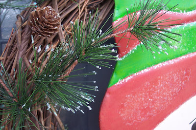 Their ends were tipped with glitter to look like snow. Perfect! I wired those around and bent the branches here and there just so. Then I hung from the door with a burlap sash. What a cutie!