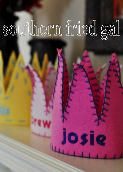 Joanna saw similar crowns online and decided she wanted to make them herself. They are crafted using flannel fabrics and fusible interfacing for stiffness. Joanna used a blanket stitch (and has the bloody fingertips to prove it). Her sister did the embroidery. I found a fantastic blanket stitch tutorial over at Futuregirl Craft Blog in case you want to give these a try.