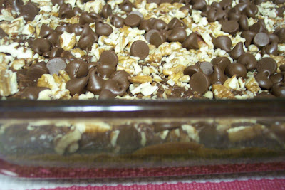 3. Stir together condensed milk, vanilla, and 1 cup chocolate morsels in a small saucepan over medium heat, stirring occasionally, 5 minutes or until smooth. Pour mixture evenly over prepared crust, spreading to edges of the pan. Sprinkle with chopped pecans or walnuts and remaining chocolate morsels.