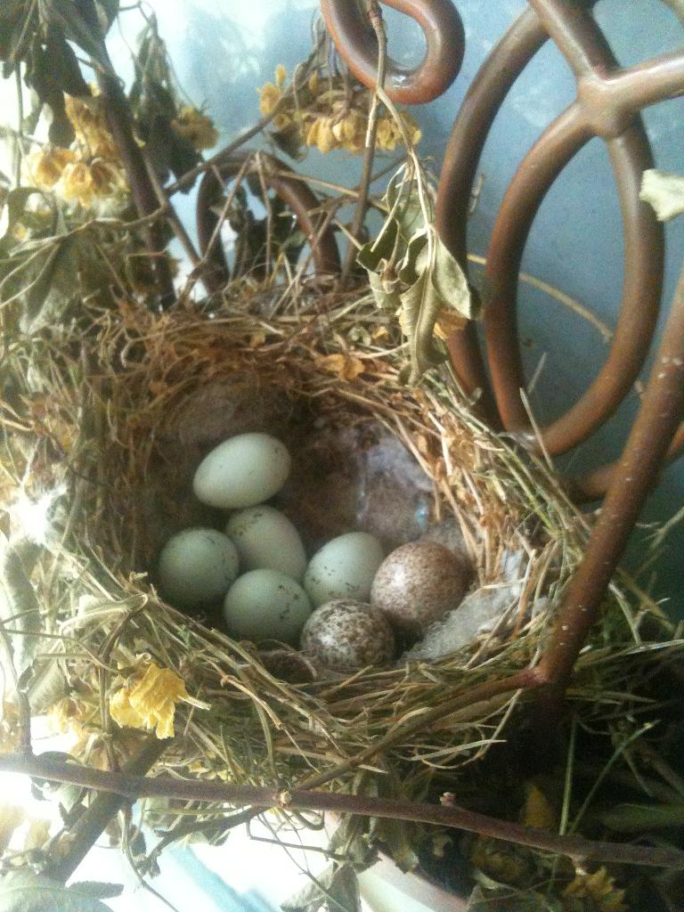Remember my friends on the porch? In the last update there were only four eggs. Now there are seven! It will be interesting to see how many hatch and survive. That is a tiny nest! I guess the economy is even hitting the birds this year. This momma bird likes to spice up her nest – notice the fuzz and Hershey Kisses ribbon? Nice touches!