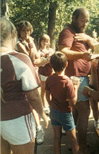 That’s him handing out trophies to the team in the cutoff shorts. That’s me to the left – sexy shorts, long mullet and all.