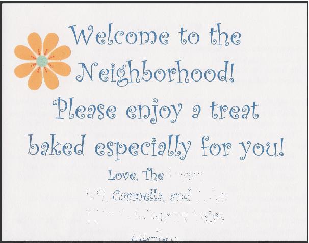 I printed this message along with our names, address, and home phone on one side of a postcard (blurred here, of course!). I put a pretty coordinating sticker to dress it up. On the back side I put the recipe for the treats.