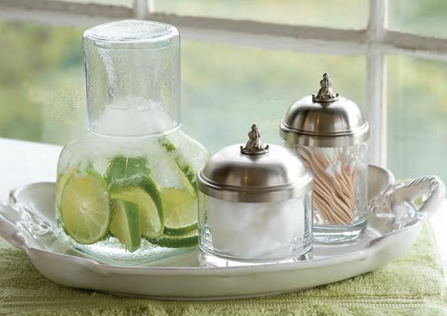 Greet guests in your bathroom with a tray of necessities and a fresh drink each morning!