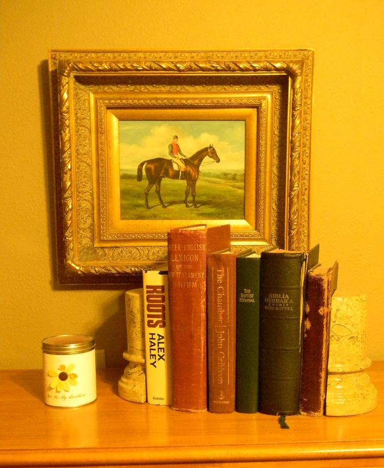 This is a fun vignette in the guest bedroom. Look at that mix of old books, horse print and friendly daisy candle. Fabulous!
