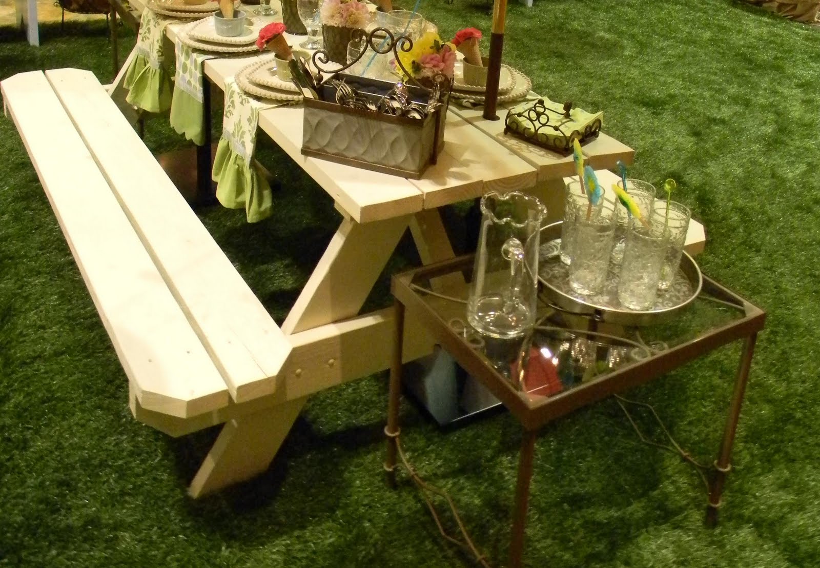 I love how our stylists added extra table space. They placed a small table on each end- one for drinks and the other for condiments. You can do this with any small table!