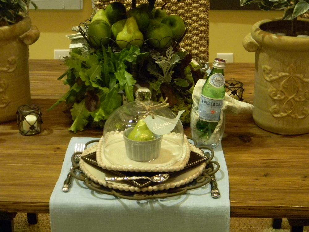 Check out how the Tiered Stand is filled with natural (and inexpensive) items. The lower basket is filled with mixed greens with a mini birdhouses tucked here and there. The mid-tier is filled with granny smith apples and pears. The top tier is filled with hypericum berries. Simple. Green. Beautiful!