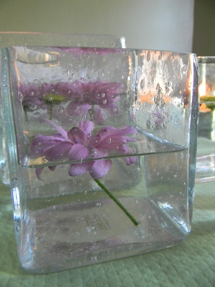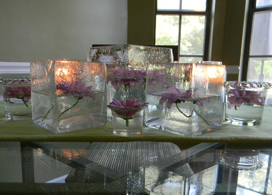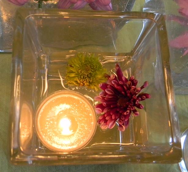 I changed it up in a few of the containers to add more interest. Thankfully my bouquet had kermit mums and deeper purple flowers. To add a little ambiance I dropped a few clear tea lights into some of the containers.