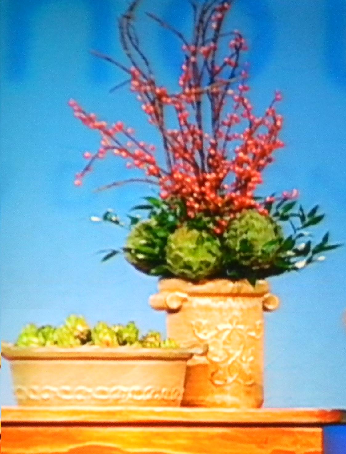 Moving closer to the holidays, the same container can be dressed up with a collar of artichokes (again from the grocery store) and given height with berries, greenery and sticks found out in your back yard!