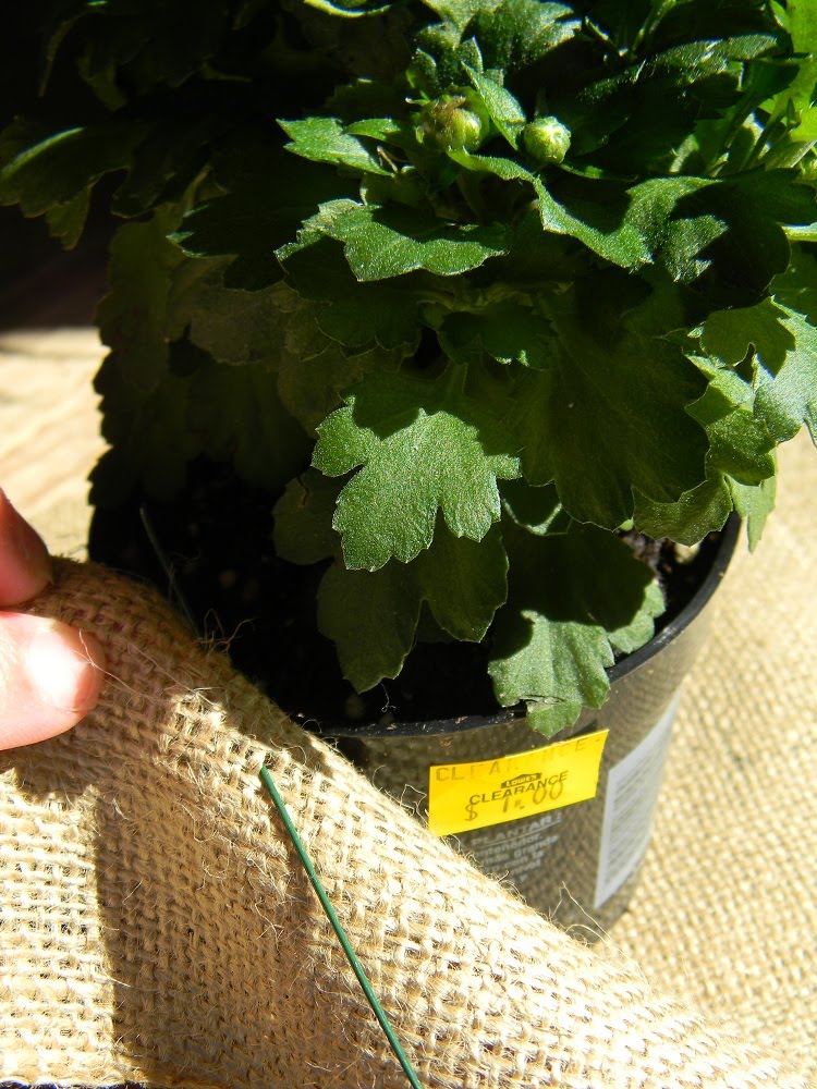 Insert the pot in the middle, cinch the burlap as tightly as you can without damaging the plant and then twist the wire several times. Fluff the burlap and wire to your garland.