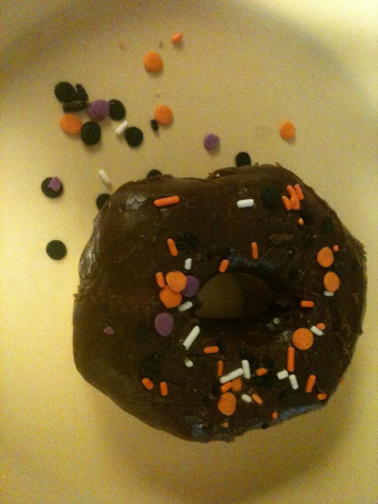 As if Halloween isn’t filled with enough sugar from the candy, BBC managed to talk DH into donuts for breakfast this morning. BBC wanted sprinkles on his chocolate donut so DH took a play from my book and added these when they got home. Totally.Cracked.Me.Up!