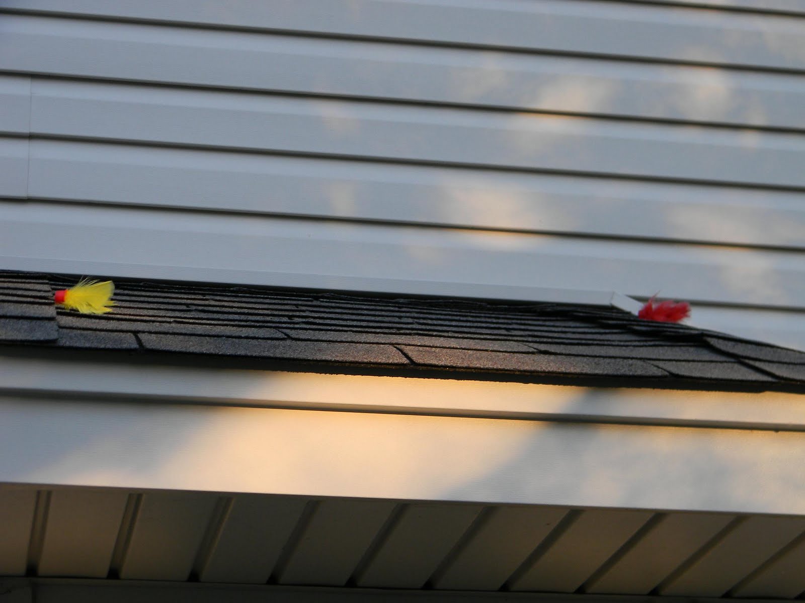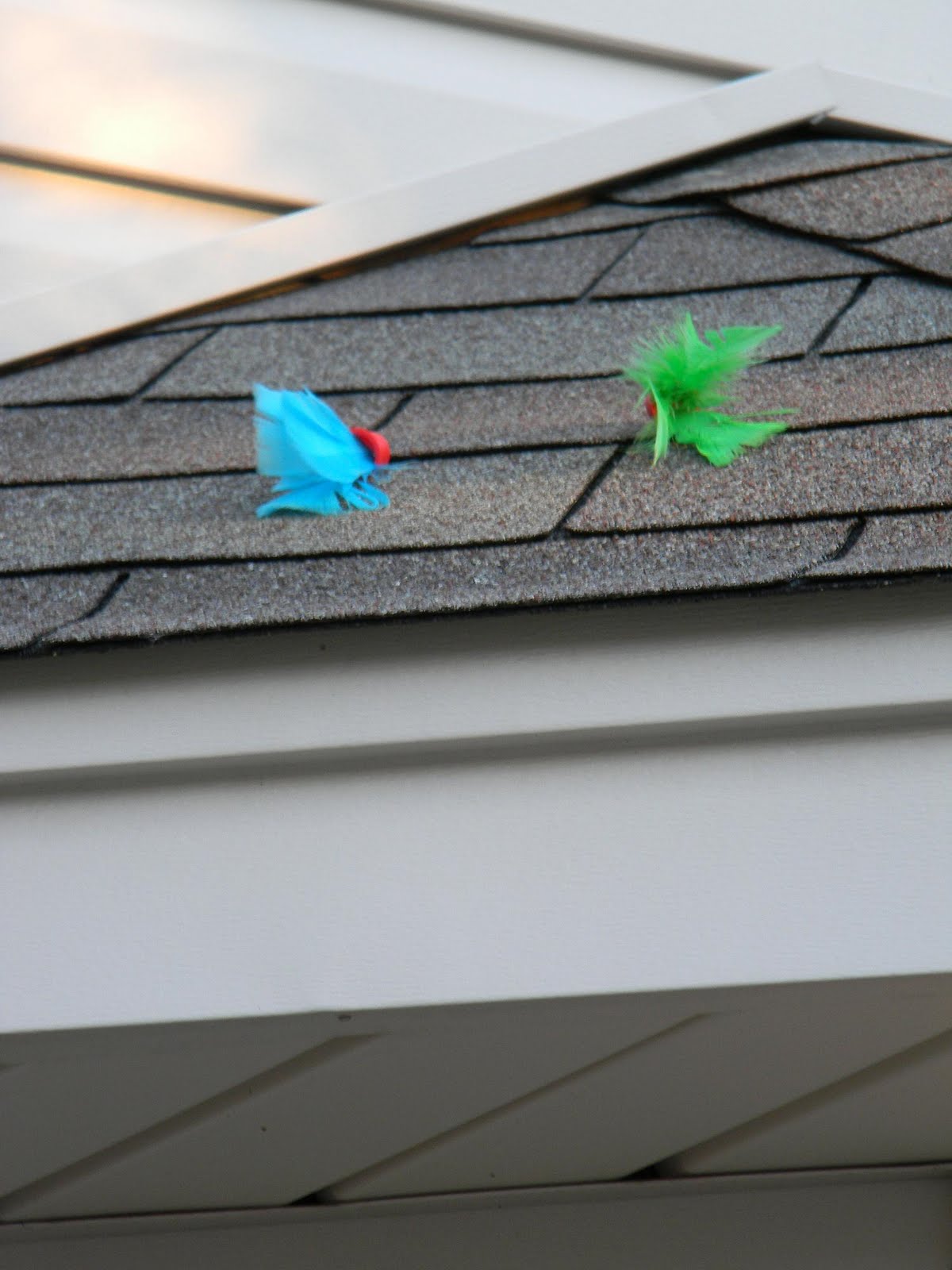 That boy never ceases to entertain me OR keep me on my toes. As it turns out they were just on the roof above the bay window. A simple sweep of the broom and he was back in business. I still get a good giggle about this little scenario.