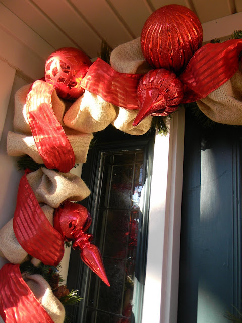 Call me lazy, but I didn’t want to get out my Christmas topiaries. I left them decorated from last year and just didn’t want to mess with taking them apart. So I added a green wreath to the top of my urns, draped the bottom of the lighted garland around the top, and tucked in more shiny red ornaments. It’s not exactly what I had in mind, but it works for me!