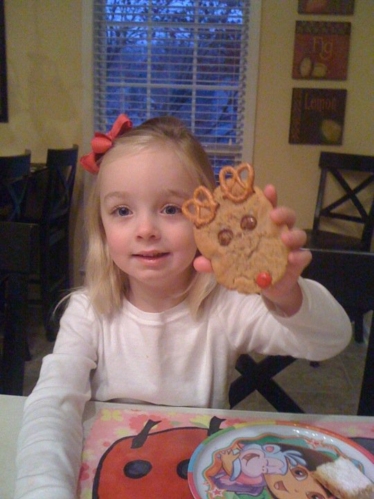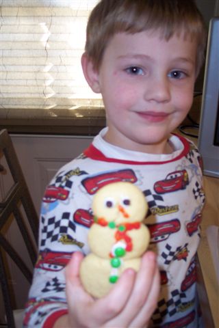 We got the idea for these cute snowman cookies from All You magazine a couple of years back. Knead 2/3 cups of all-purpose flour into a 16ish oz roll of refrigerated sugar cookie dough. The recipe said to make three small balls (3/4 inch, 1 inch, and 1 1/4 inch), place close to each other on parchment lined cookie sheet and flatten slightly. Bake 12 minutes in preheated 350 degree oven.