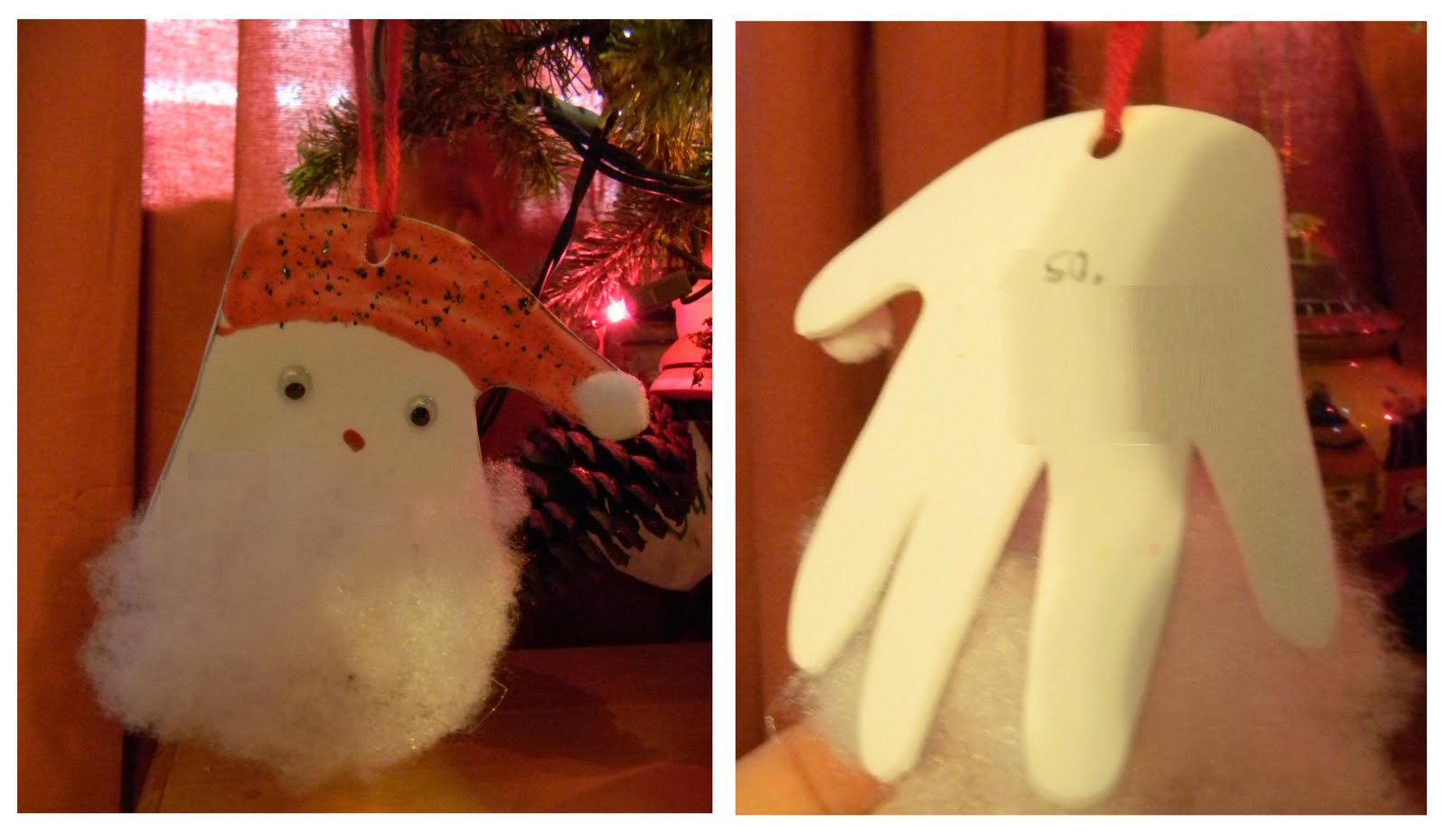 hand-painted Santa cards/art project. His hand was traced onto a foam sheet and cut out. Then the front was decorated with paint, googly eyes, glitter, poly fill, and a pom pom to look like Santa. We also made a reindeer similar to the paintings.