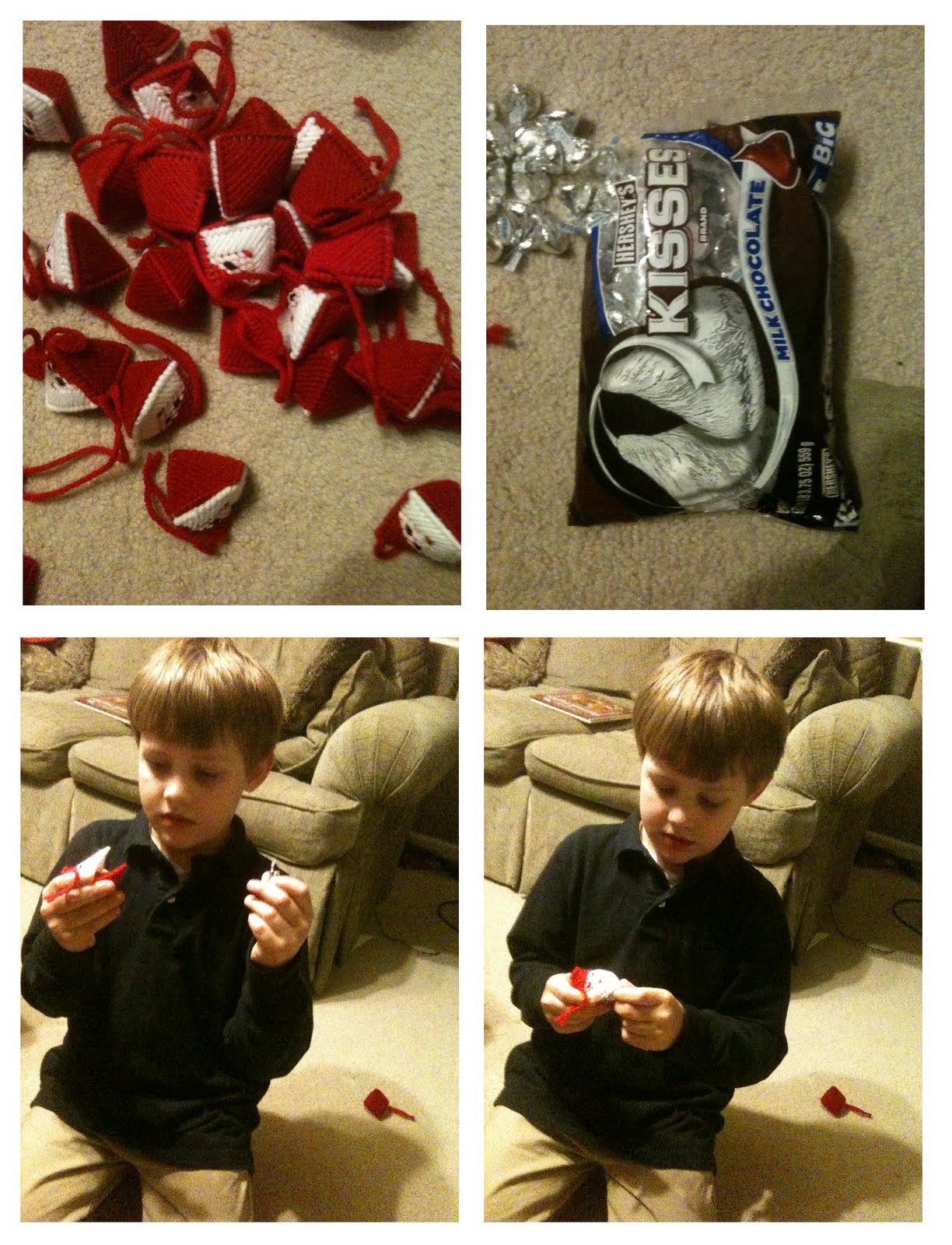 BBC’s last day of school for the year. Their Christmas party was today as well. Each year my mom makes something for BBC to share with the children in his class. This year she made this adorable Santa Kiss ornament.