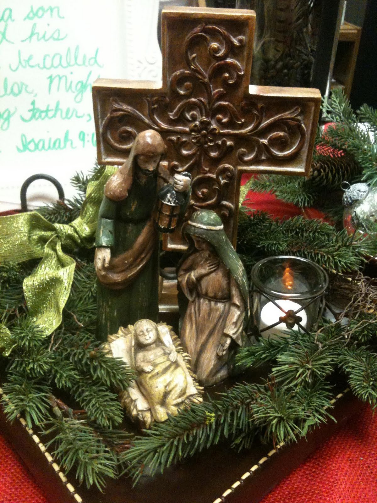 Natural Habitat is my sweet spot of home decor. A trend or not, it is the foundation of my decor. I shared ideas for a burlap table runner to bring in natural texture. Add greenery, a wonky bow, and a votive to a favorite platter to showcase the Holy Family.