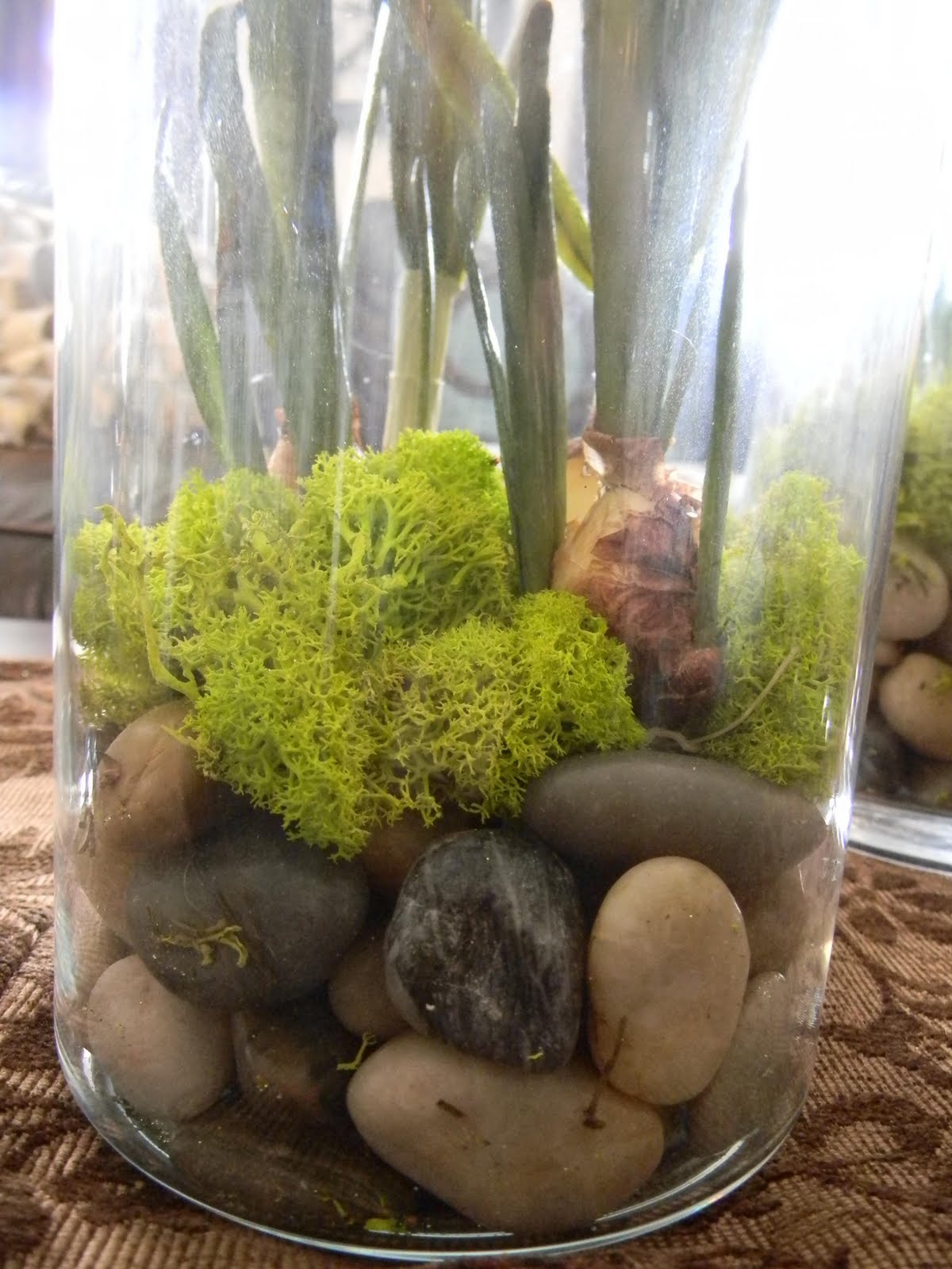 I grabbed some smooth river rocks (great filler to have on hand), bright green reindeer moss (my obsession continues), and my paper white bulbs. Are they real? No, but I think they are pretty convincing and a whole lot less messy.