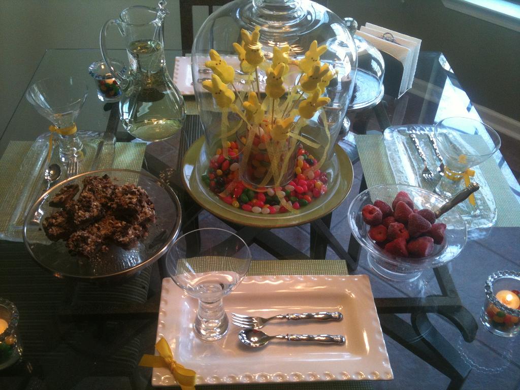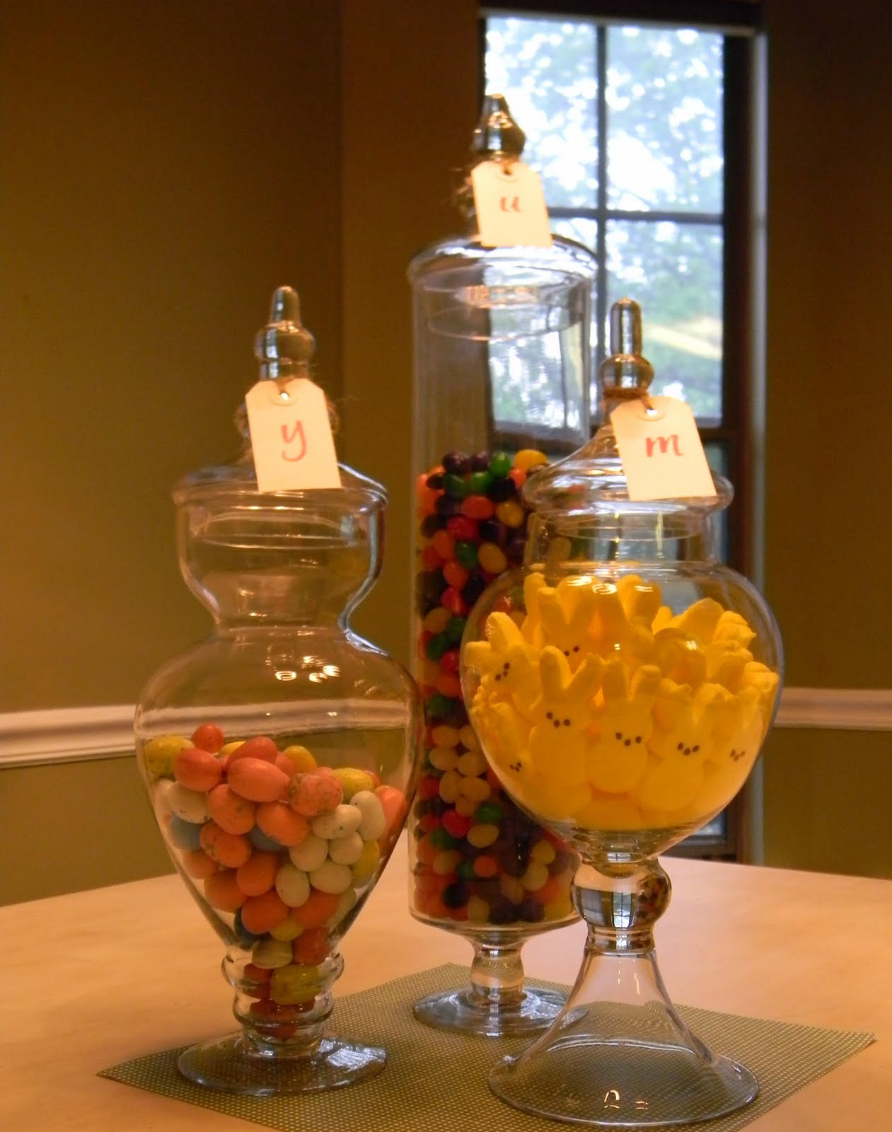 This year for a quick centerpiece, I gathered up an odd number of glass containers and filled each with classic Easter candy. To finish off the look, I used tags to spell out y-u-m. Cheap, easy and best of all edible!
