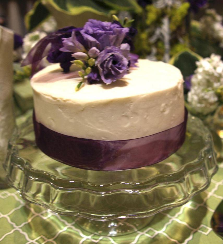Add pretty ribbon and fresh flowers to dress up a plainly iced cake.
