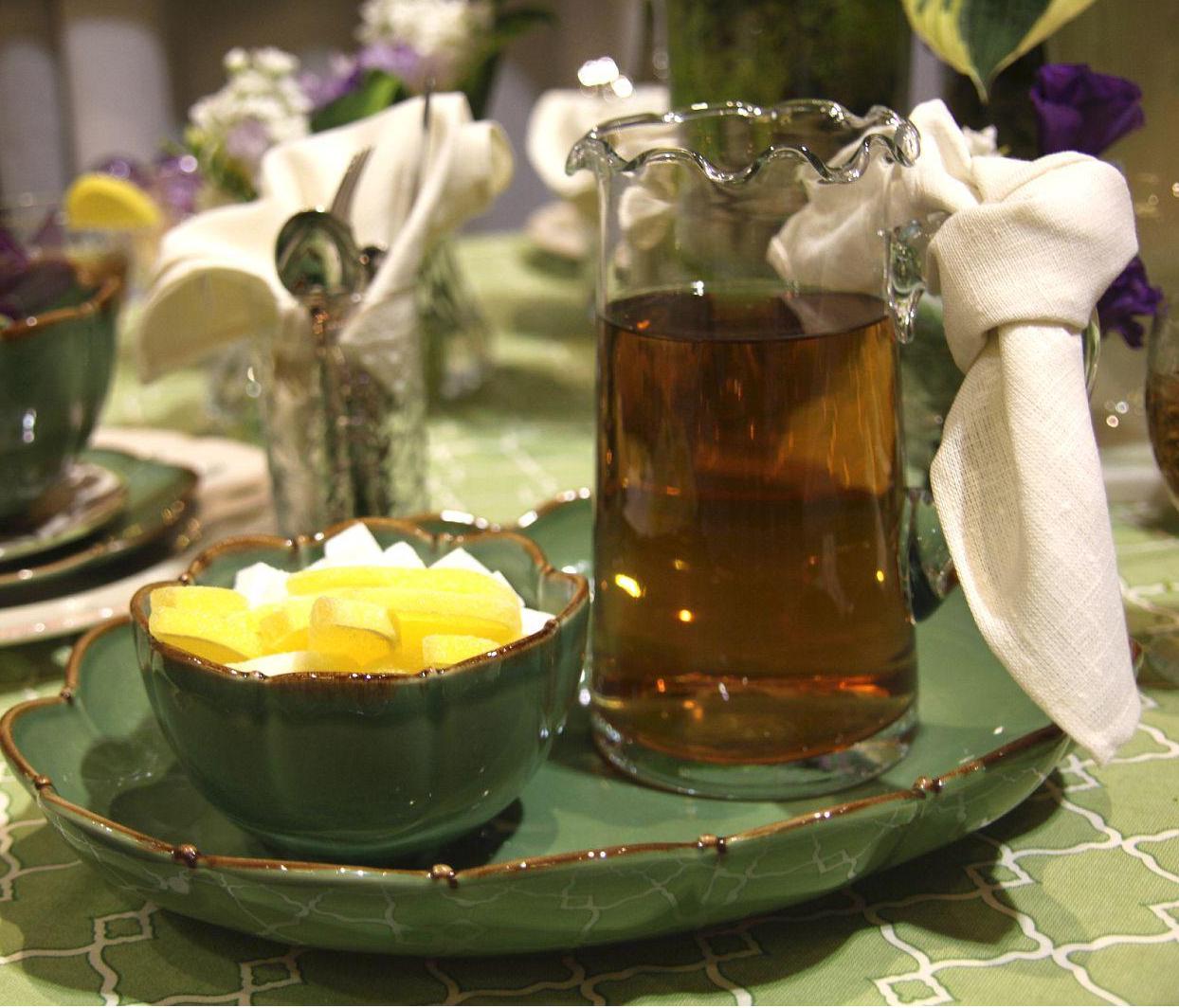 Think outside the box – a chip and dip and glass pitcher serve up iced tea with fresh lemons in grand style.