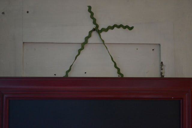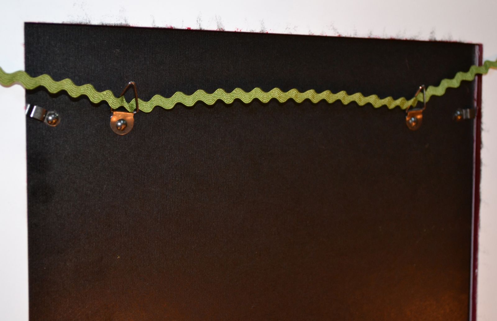 I reassembled the frame and strung a piece of olive green ric-rac through the rings on the back….