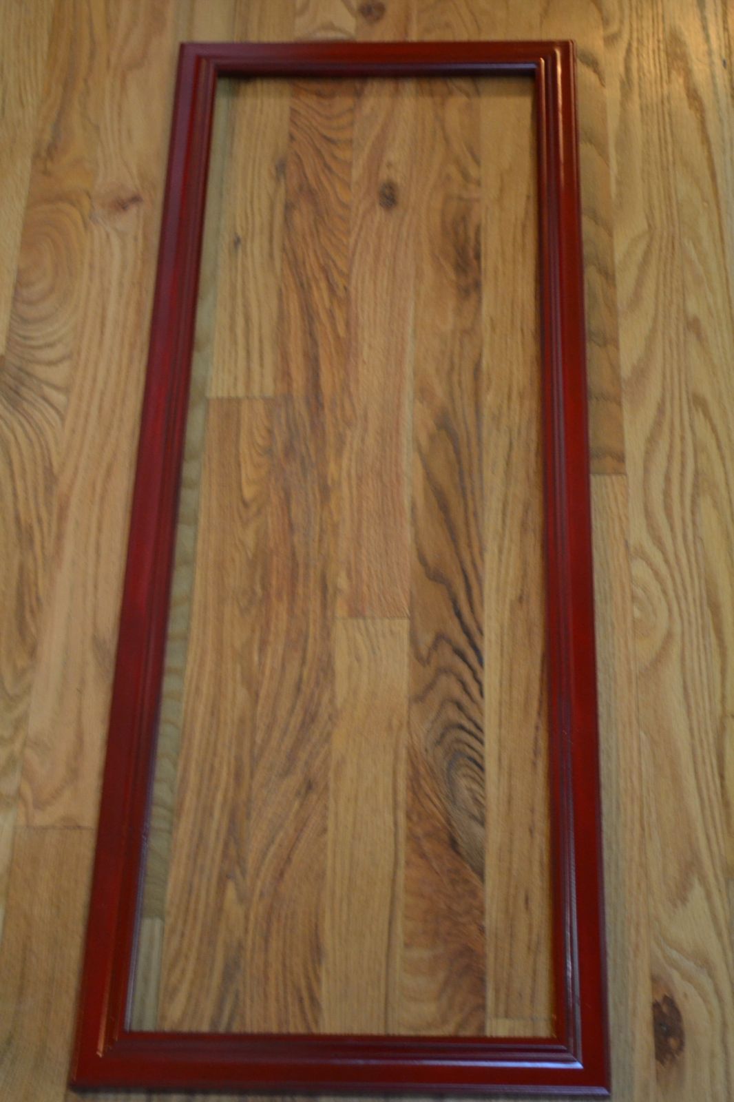 I got a long, white, wooden picture frame at the craft store for $11.99. (It was marked way down because it had black marks all over it.) Luckily, the black marks didn’t make a bit of difference to me since I was planning to paint it RED, anyway!