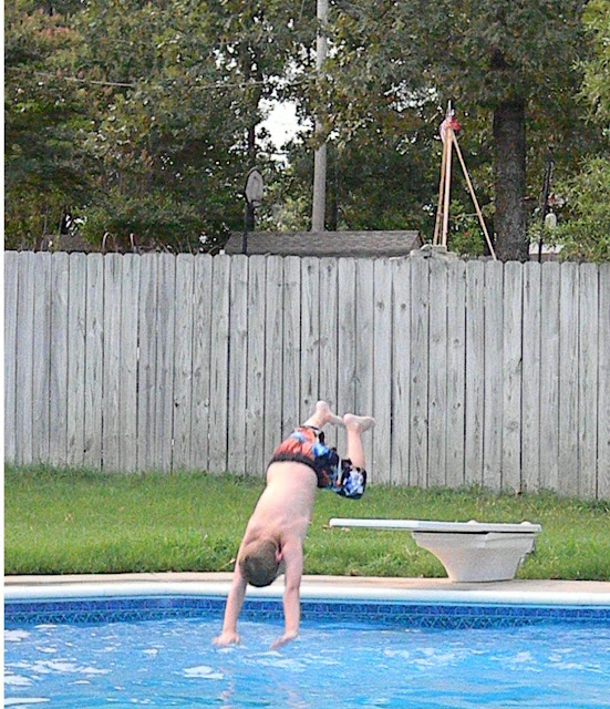 My incision is finally healed enough to get into the pool. It’s a nice way to relax, do a few exercises, and cool off. Last night DH wasn’t feeling well so BBC and I had a mom/son date in the pool. It started with a lot of showing off on his part.