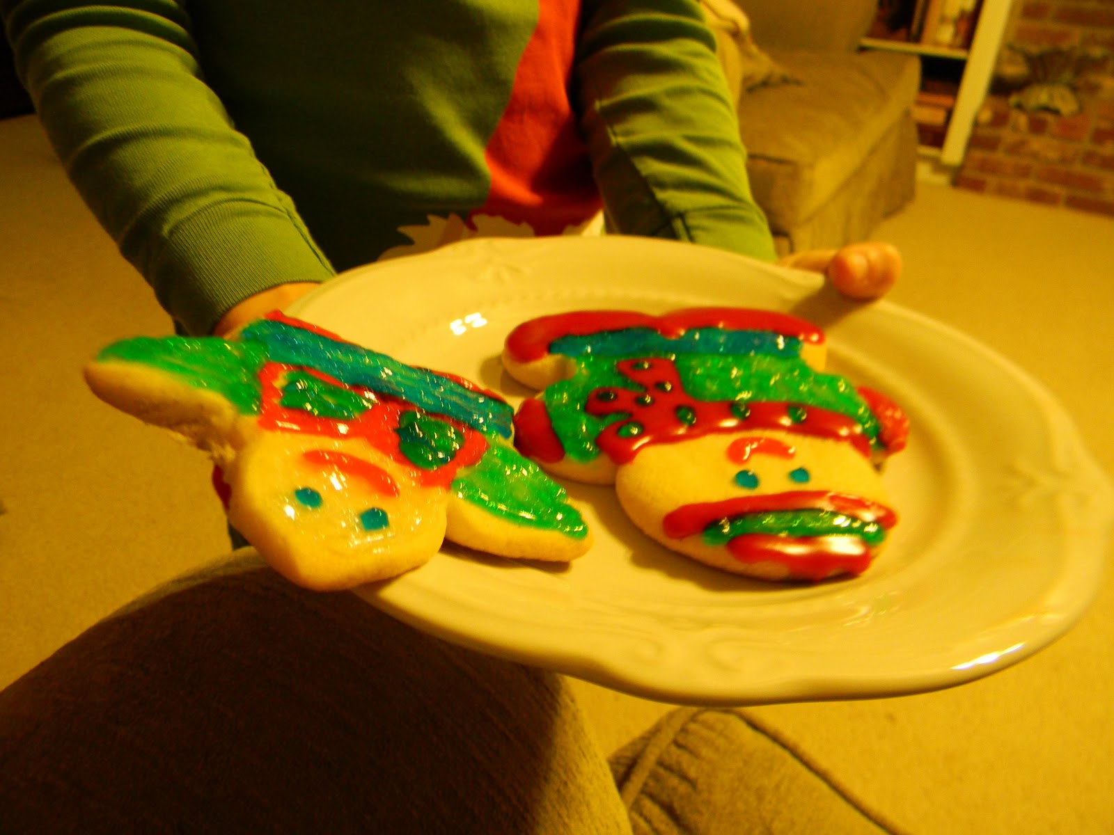 We baked and decorated cookies for Santa together. Even DH got in on the fun. He’s responsible for the star character on the left.