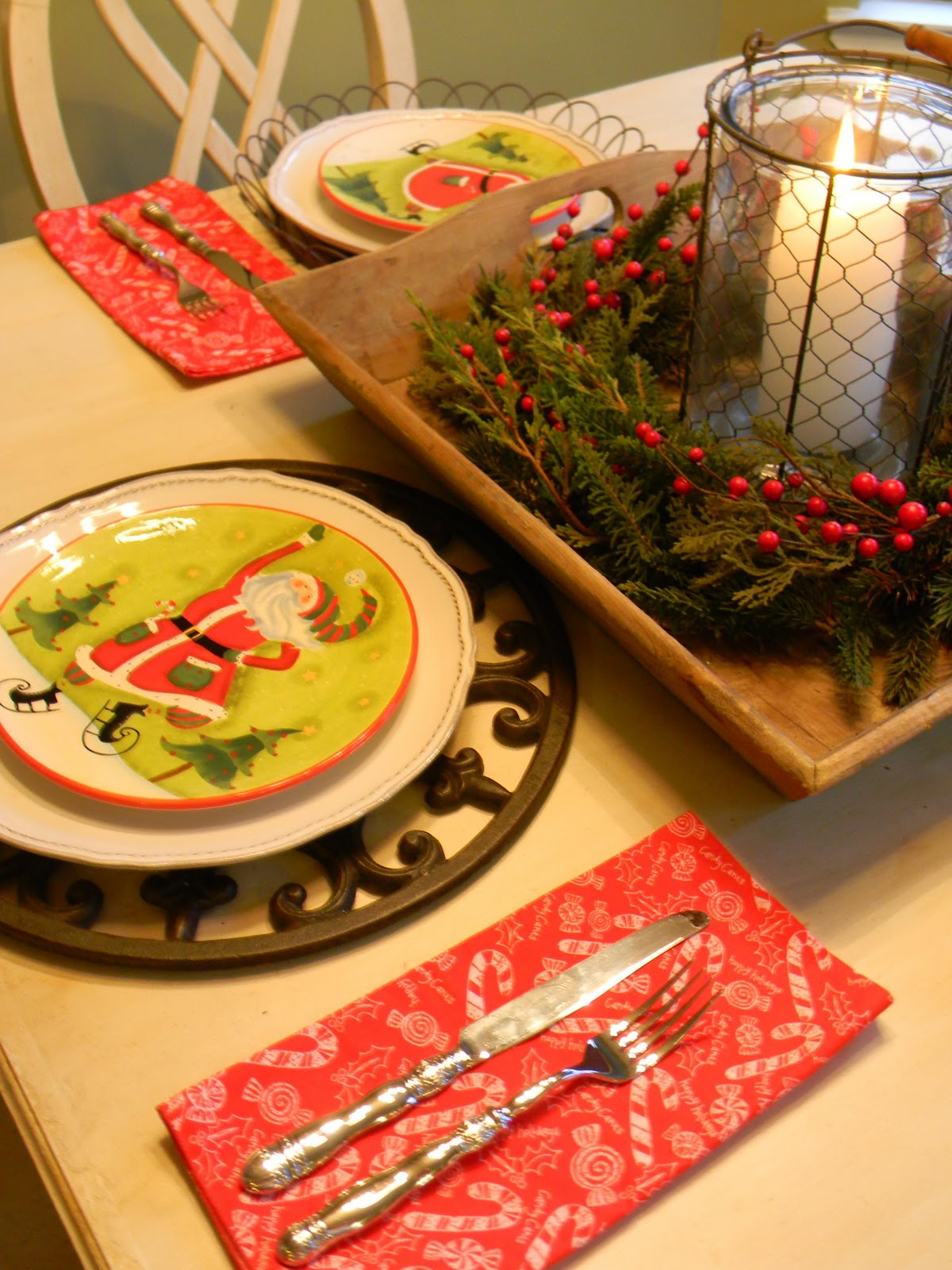 At the end of the hall is the breakfast nook in the kitchen. I found that wooden tray for around $20 back in November. I envisioned a rustic centerpiece for the table with fresh greens and berries. The greedy birds around here picked every last berry of the bushes so I had to settle for faux. And of course I had to add a touch of whimsy with the cute Santa plates. Simple and fun!