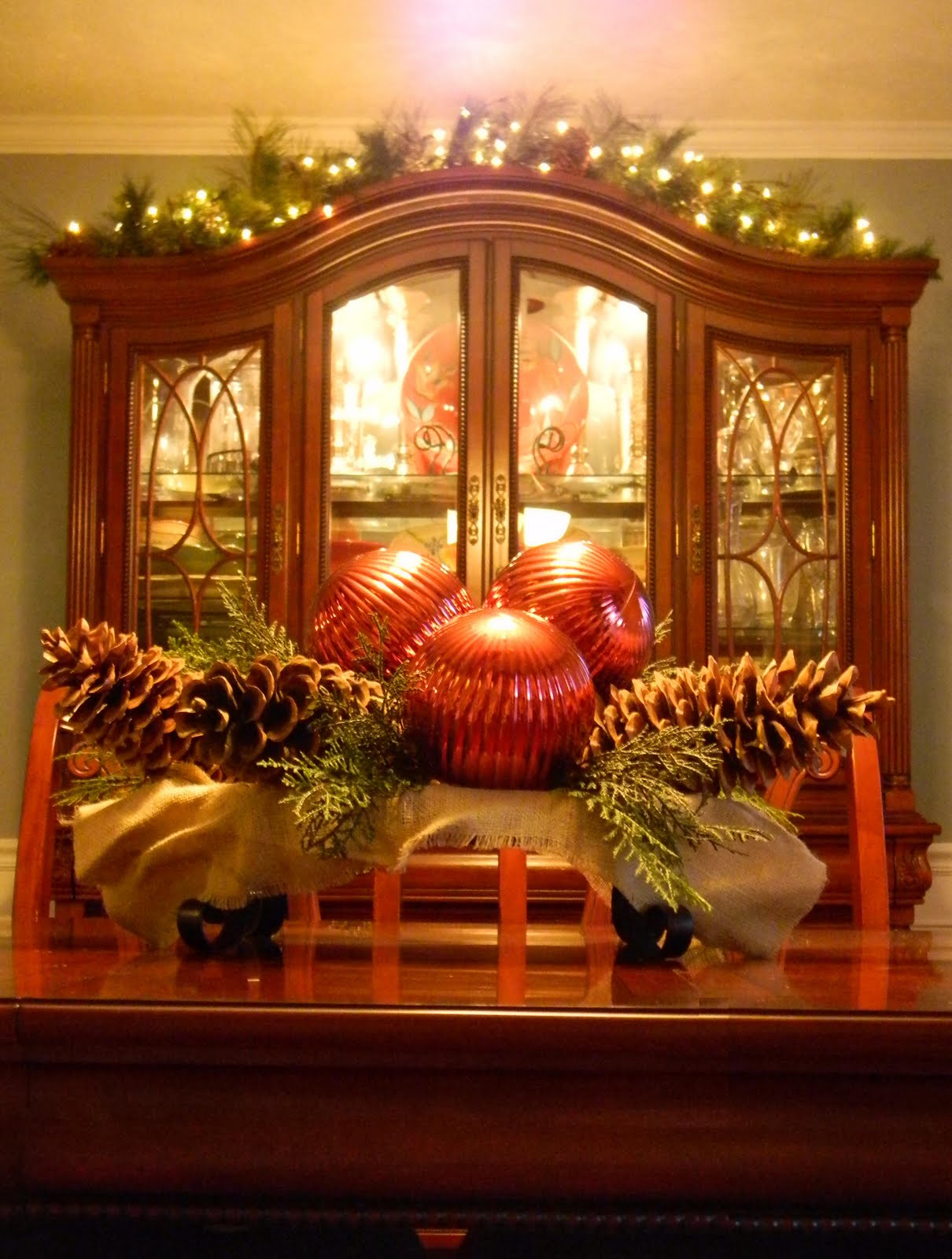 Finally as we circle back around the stairs we get to the formal dining room.The china cabinet is topped with a lighted greenery garland. A simple centerpiece of burlap, sugar pine cones, arborvitae and bling top the table. And that’s it! Simple, simple!