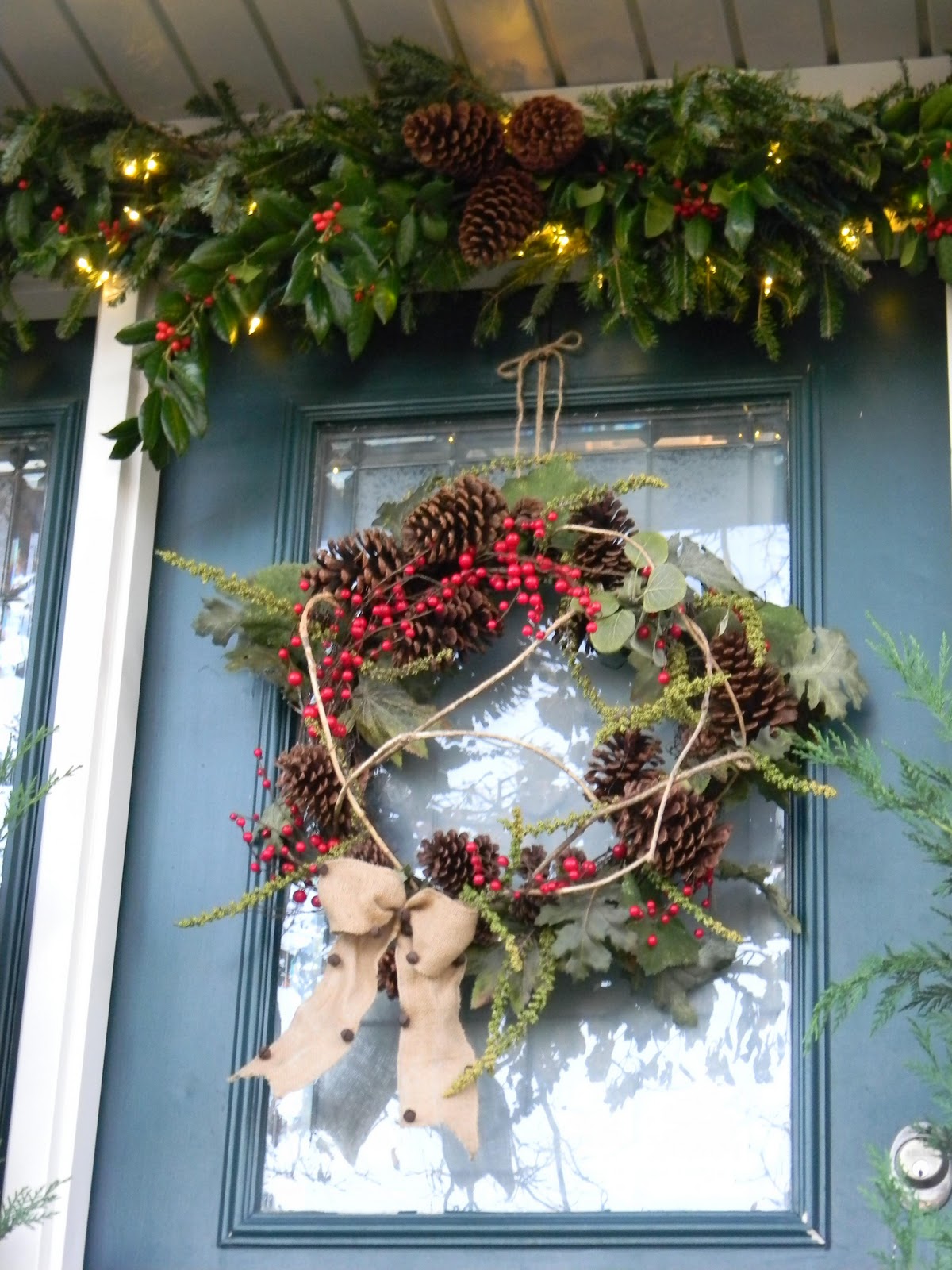 This year I decided to go all natural on the front door. The only hint of faux is the wreath and there are still quite a few natural elements there.