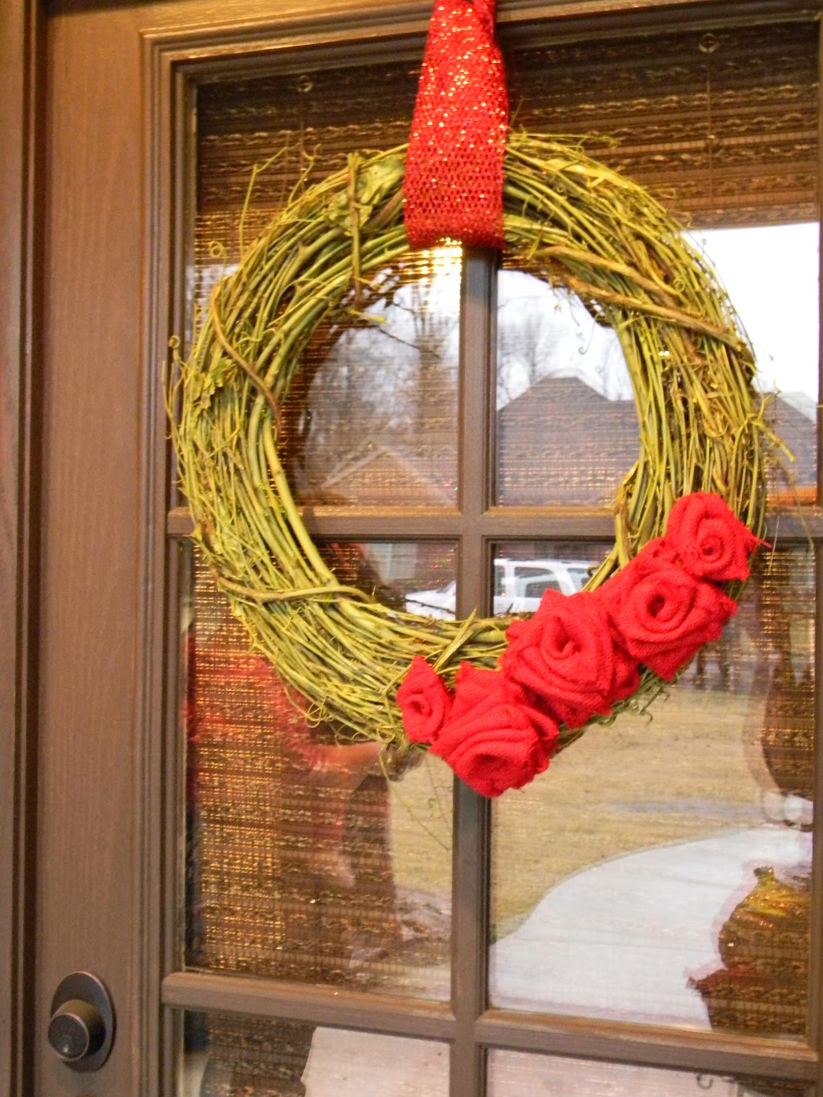 I was looking through pictures for inspiration and came across the wreaths my friend Bridget used at Christmas. This could easily pass for Valentine’s day just as it is or you can change it up. Instead of green, paint the grapevine wreath white with the red roses. or vice versa. It would be cute with bright pops of color, too – use your imagination! Here’s a tutorial for making burlap roses – super easy!