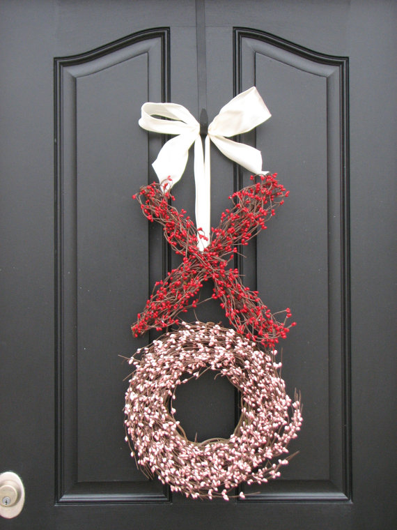 The X form can be made from branches you collect around the yard and wire together in the center with florist wire. Hot Glue pieces of red berry garland to the branches OR to simplify spray the sticks with red paint. The O is a wreath covered in pink berry garland and could also be as simple as a grapevine garland painted pink. Wire them together with florist wire and dangle from a white floppy ribbon. Super cute!