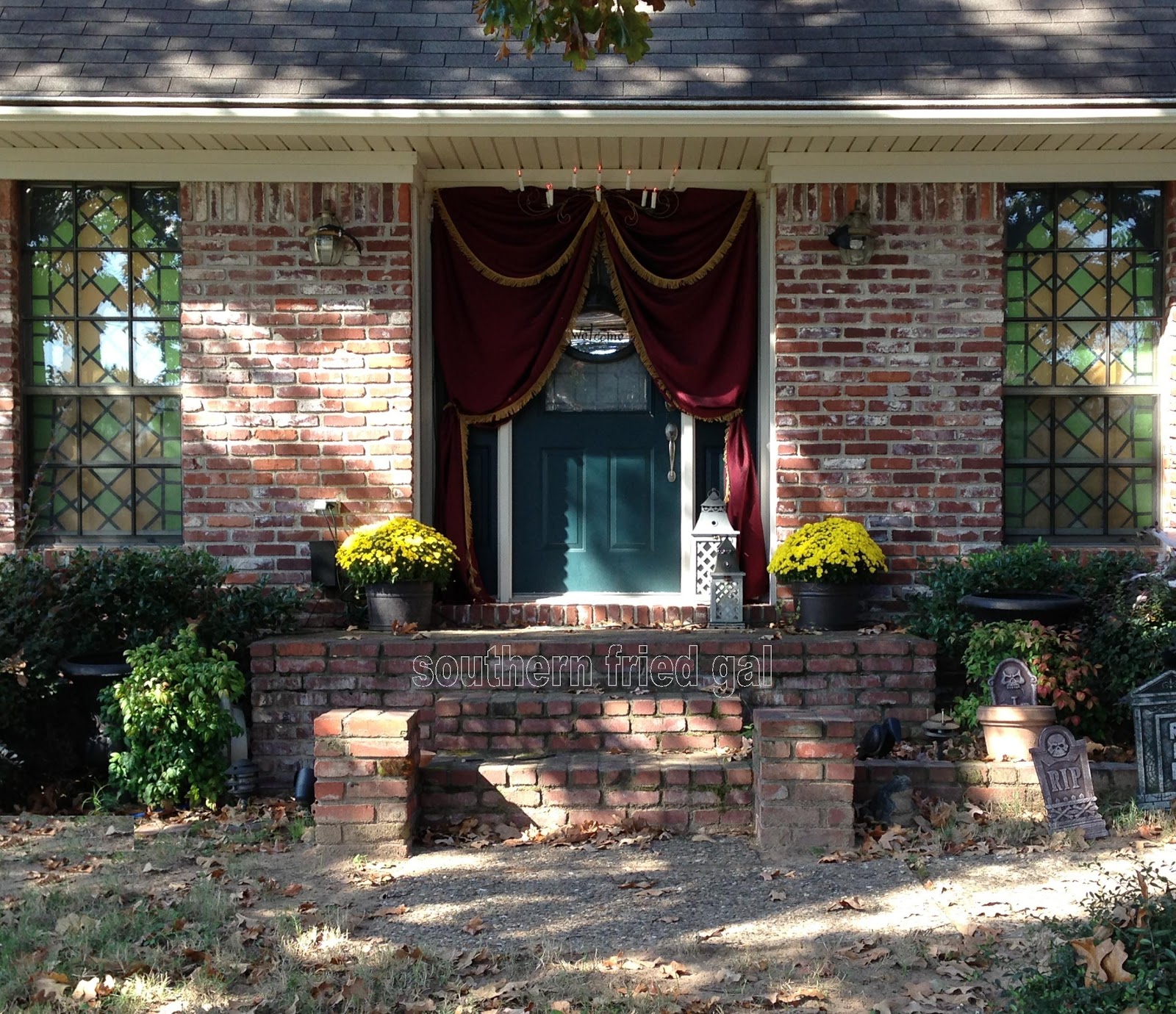For my portion of the project, I made the tacky curtains and rigged together a candelabra using Christmas lights and two brass sconces from Goodwill ($6). I finished it off with a few hospitable touches like the fun-house mirror turned welcome sign. I found that plastic mirror on deep clearance ($4) last year and my BFF made fun of me for getting it. It looks like carved wood and is perfect for our door.