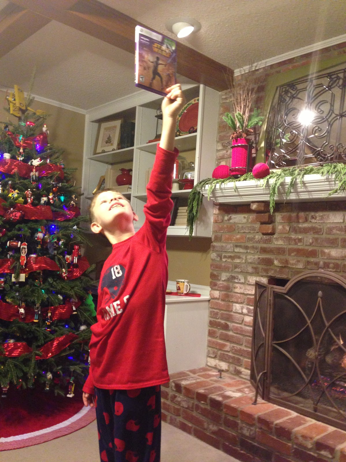 After soaking in water overnight, the decorating began. The boys talked me into big, colored lights this year. I’m more of a warm, small light kind of gal but I figure every now and again I should let the rest of the house have a say. I wove in a bit of red ribbon and then BBC got busy loading the tree up with ornaments. He was so cute standing on that trunk and I couldn’t resist snapping a picture – even if he was in his skivvies!