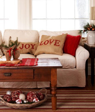 I wasn’t inspired to make a wreath this year and really wanted to do something a little different. I fell in love with these burlap pillows on womensday.com but knew they wouldn’t work with my sofa.