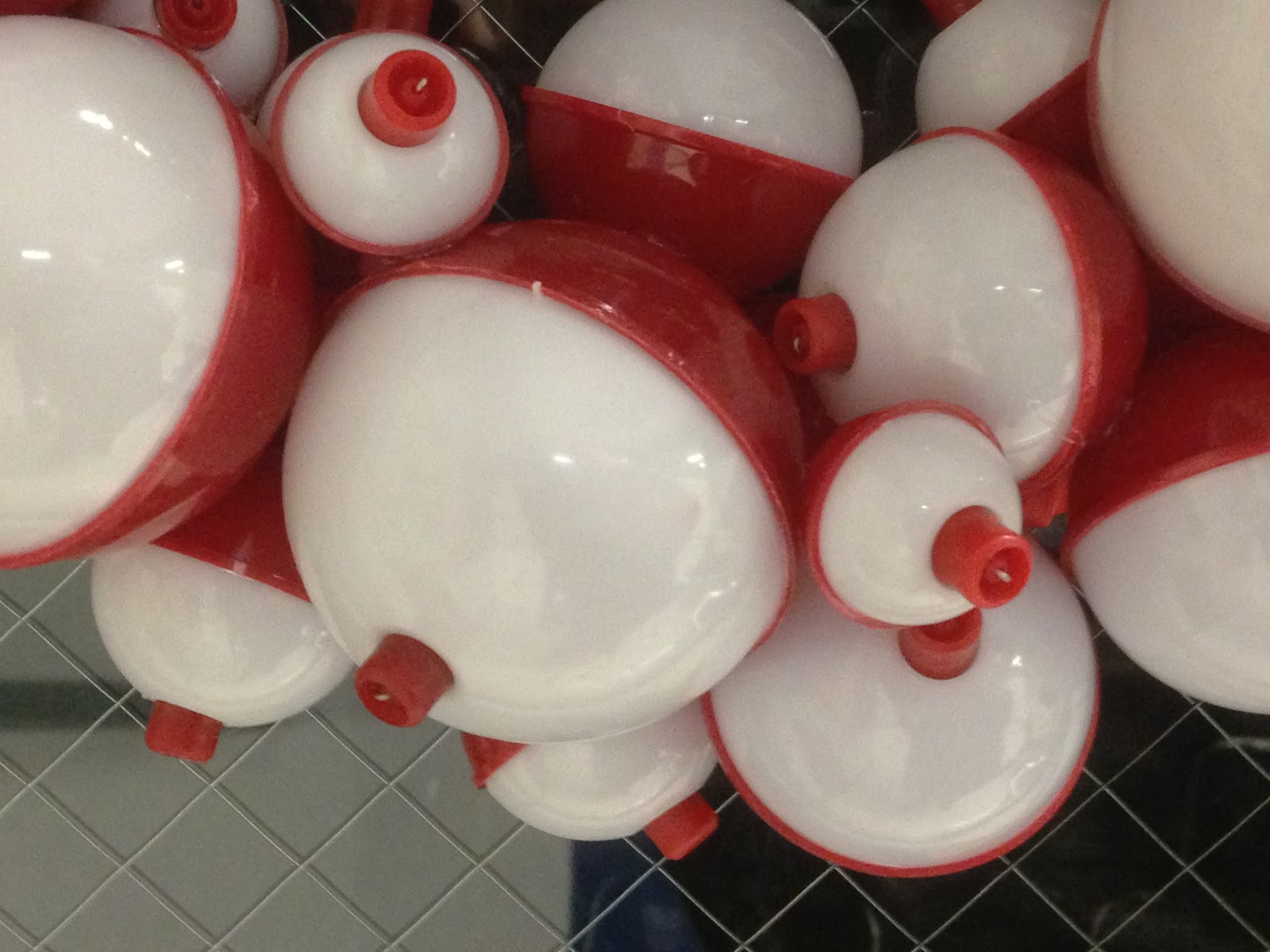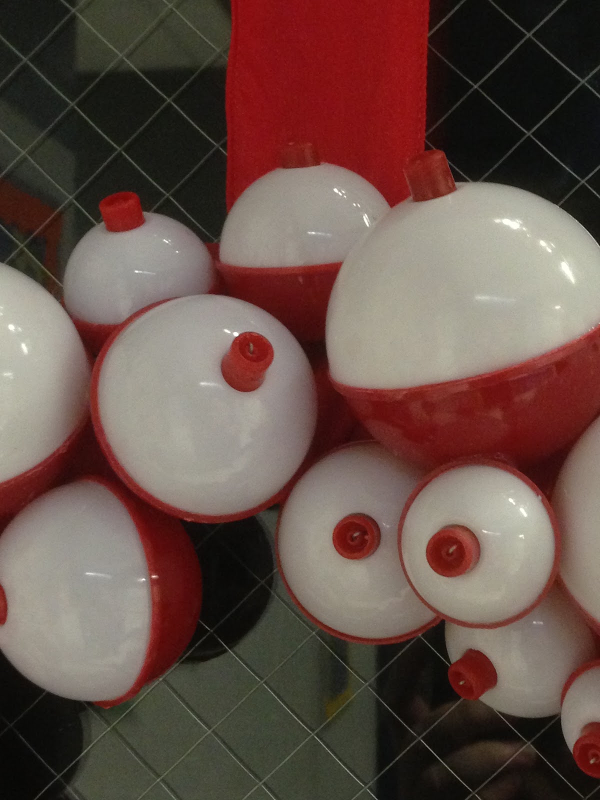 I envisioned this adorable wreath from the Matt & Becky blog with varying sized fishing bobbers instead. This post has a full tutorial for making a Christmas ornament wreath. However, I planned a different approach for my wreath.