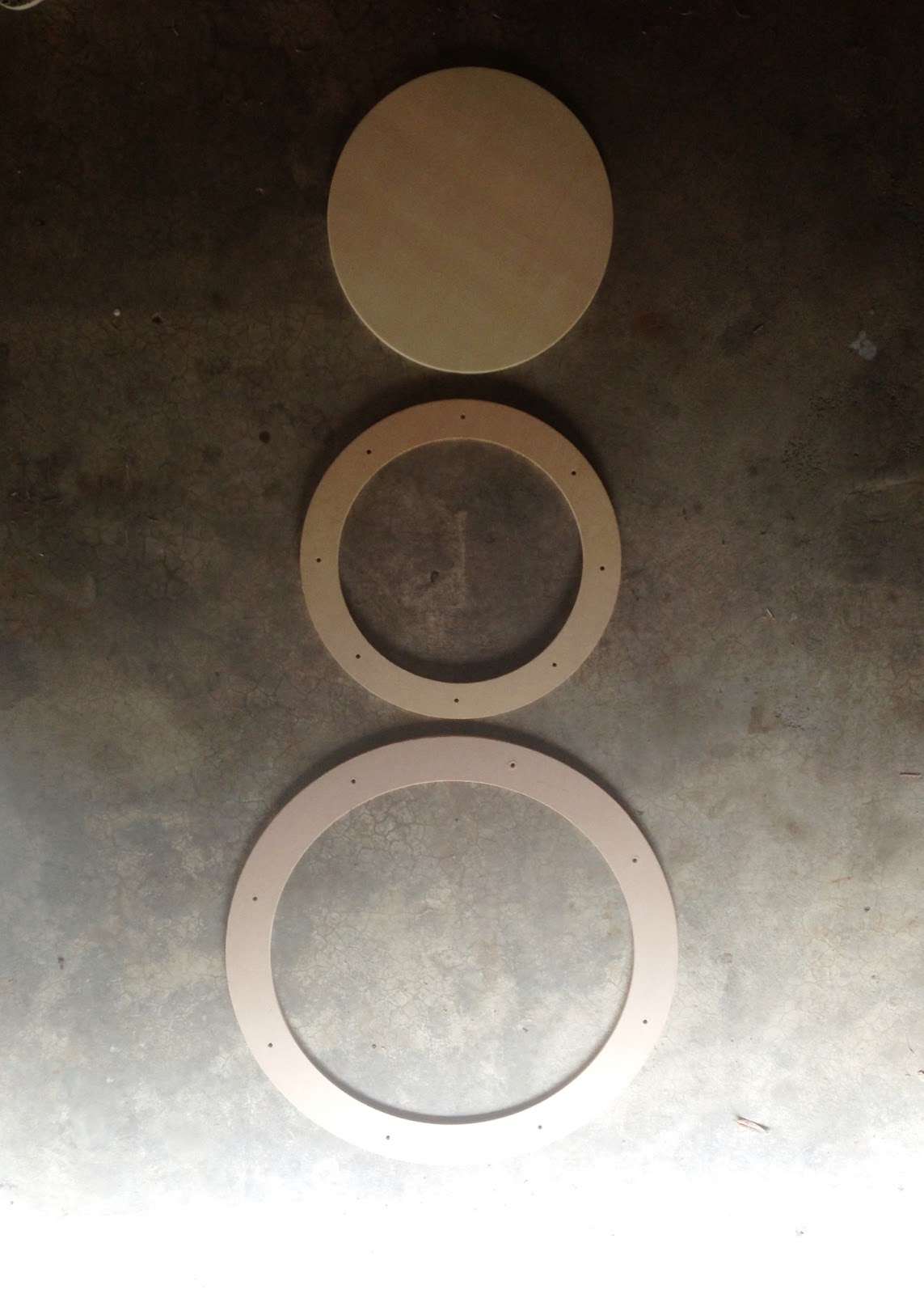 I decided for January the door needed a snowman. Not original, but I did it a bit differently. As you can see from the previous picture, the door has a large window that can’t be blocked. I was planning to make the entire snowman from MDF wreath forms (found these at Michael’s craft store) to get the shape of the snowman without covering the window. At the last minute I decided the head needed to be a solid circle for the standard snowman features.