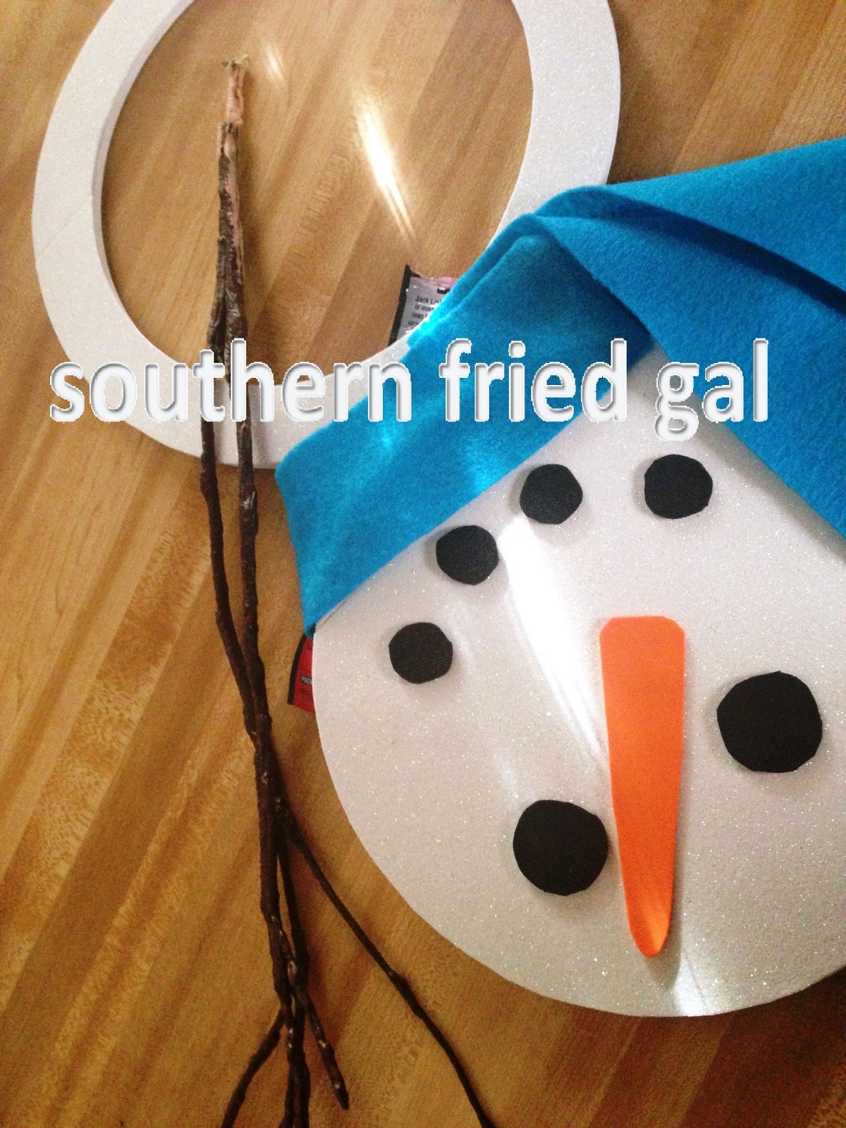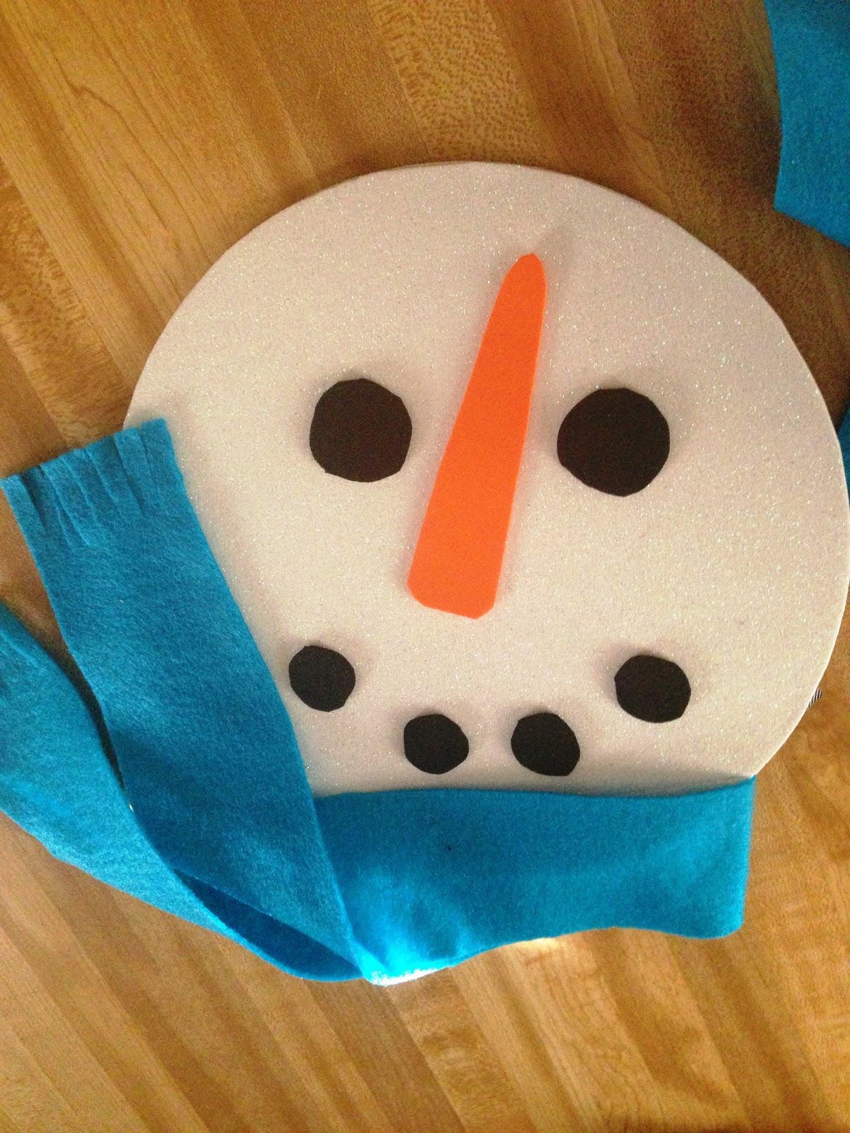 Next using more self-adhesive foam I cut out the eyes, mouth and nose. I did rough, freehand cutting since none of the real materials are perfectly formed. The scarf is nothing more than a sheet of felt cut into 3 even-width strips, snipped on the ends to create fringe and then hot-glued here and there.