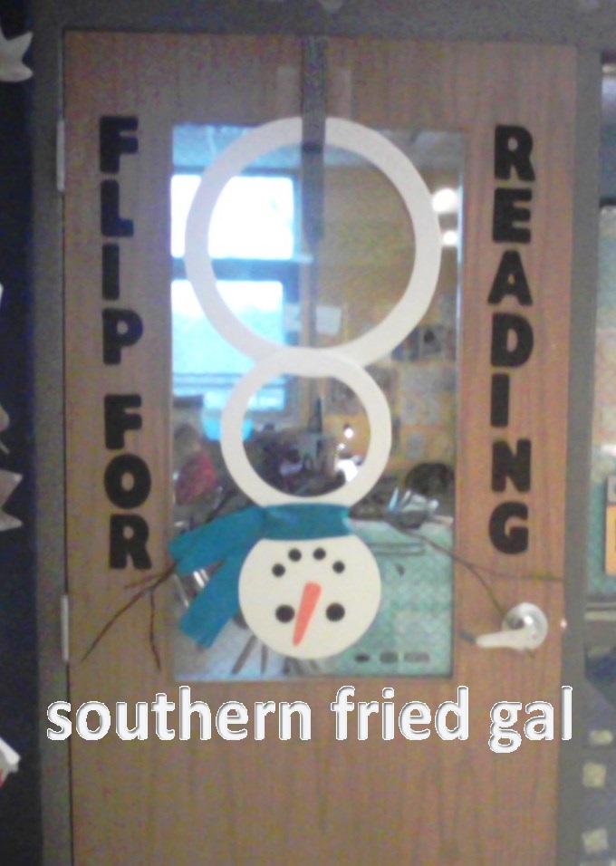 Here he is fully assembled and hanging – UPSIDE DOWN – from a black and white gingham ribbon. That’s where the corny comes into play. I chose to flip him upside down so I could have a little fun with the message…FLIP FOR READING. OK, so the upside-down snowman confused some of the kids but hopefully they will grow to love him and more importantly reading!