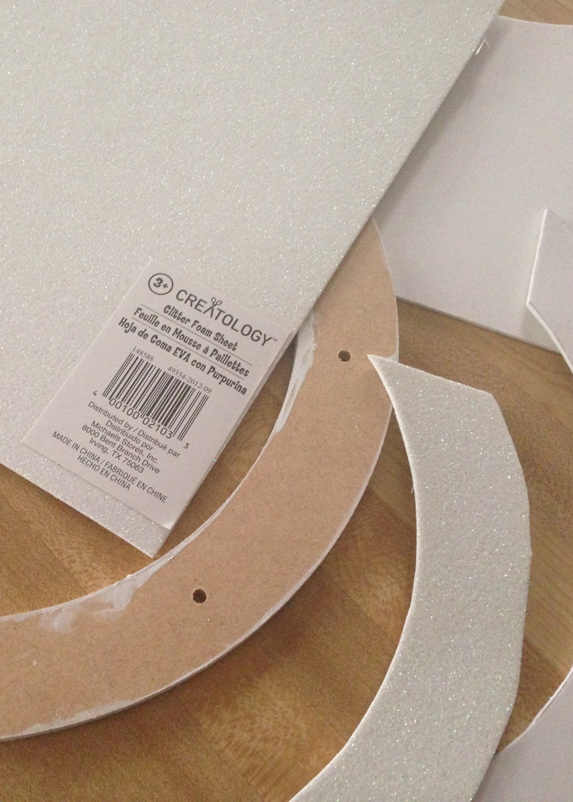 If I were using this wreath on my outside door, I would have patched the holes in the wreath form, spray painted white and then glittered. Since this is inside, I cheated a bit by using self-adhesive, glittered craft foam. I simply traced the forms on the back of the foam, cut out and stuck to the wreath forms. Easy, peasy!