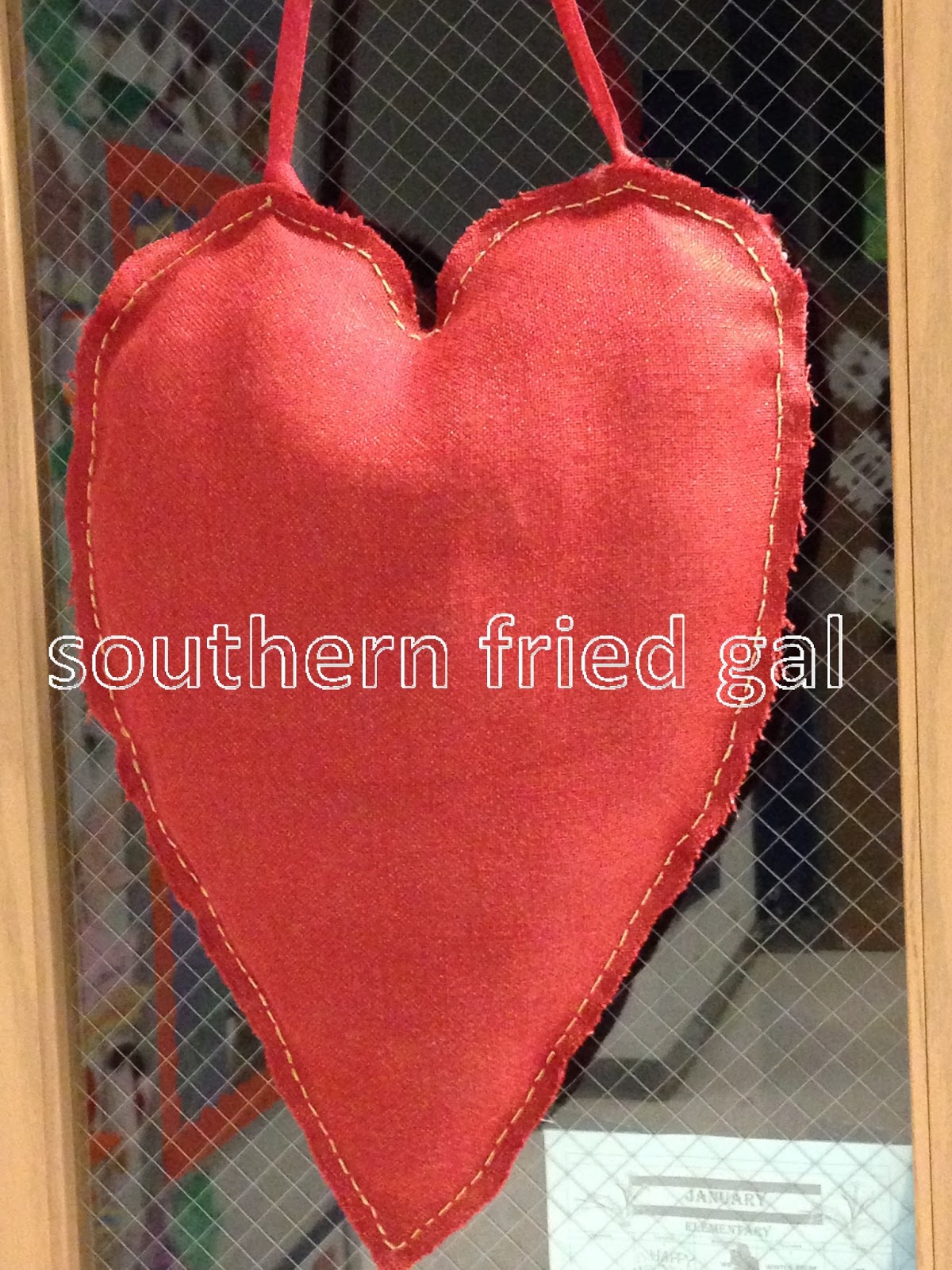 On a recent trip to Joann Fabric and Craft store I found a fun red burlap fabric with gold thread highlights. I was planning to do a burlap puffy heart for BBC’s classroom door and this added an unexpected element.