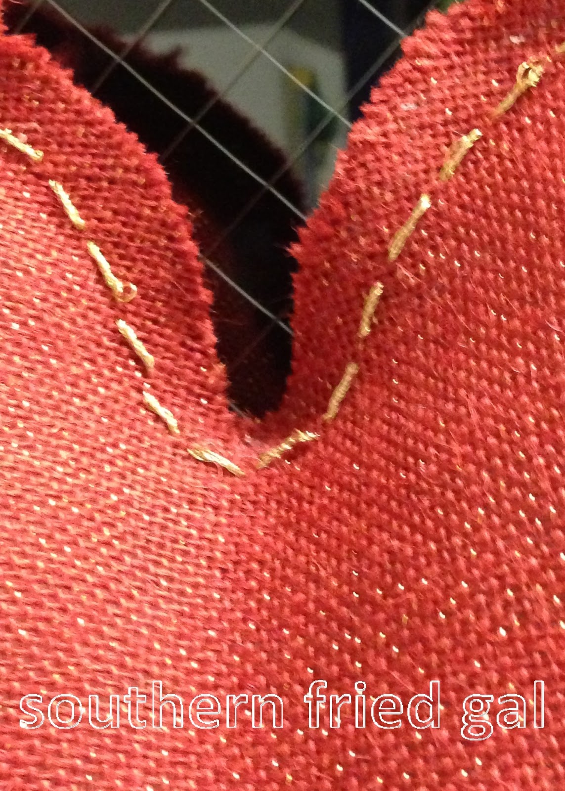 Having found my inspiration, I grabbed 3/4 yard of the burlap, a bundle of coordinating gold metallic embroidery thread, a small bag of polyfill and a small spool of 1/2 inch red burlap ribbon.