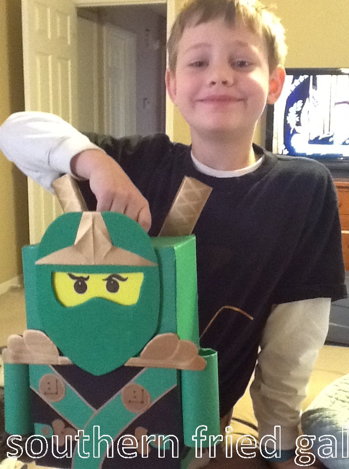 BBC’s teacher asked her class to create Valentine boxes instead of using paper sacks this year. A project with the boy is always fun. Of course BBC wanted a Green Ninja (from the Lego Ninjago series) themed box. He was very specific about the uniform he wanted for the box.