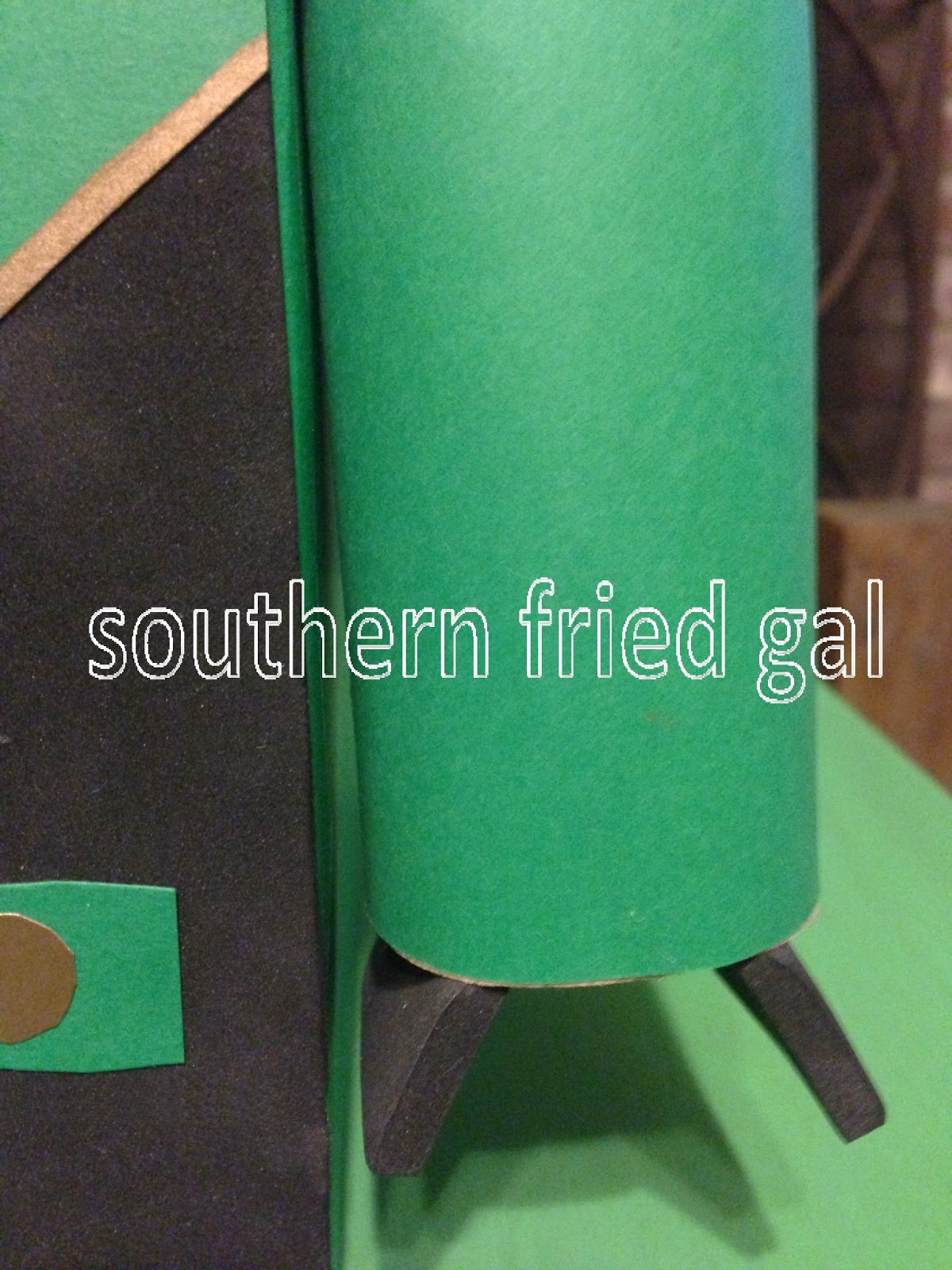 The arms are simply green paper wrapped around toilet paper rolls and secured with tape. The hands are rectangles of black foam attached to the inside of the arms using hot glue. The arms were attached to both the shoulder armor and the side of the box using hot glue.